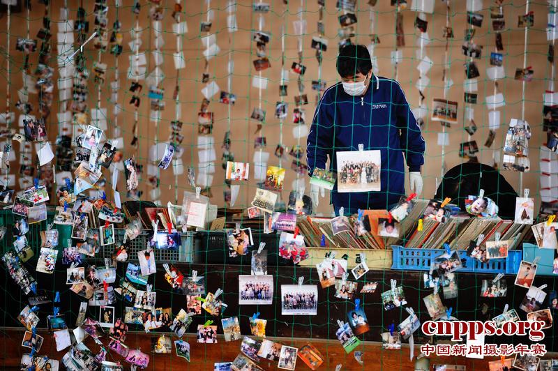 日本宫城县名取市。一名当地人在位于小学体育馆内的地震海啸遗物收容处寻找和自己有关的照片。