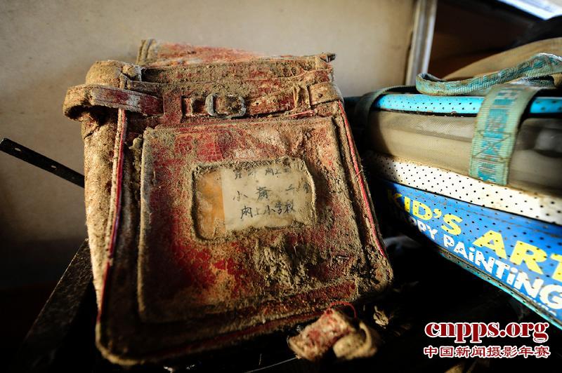 日本宫城县名取市。一个等待被认领的小学生书包。