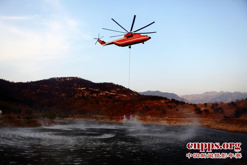 4月19日下午,济南长清万德镇店台村卧龙峪附近一水库,米-26直升机正在水库中取水,旋翼卷起的强劲气流在水面上卷起了阵阵水雾。(第二届中国新闻摄影年赛战争、灾难类新闻组照铜奖)