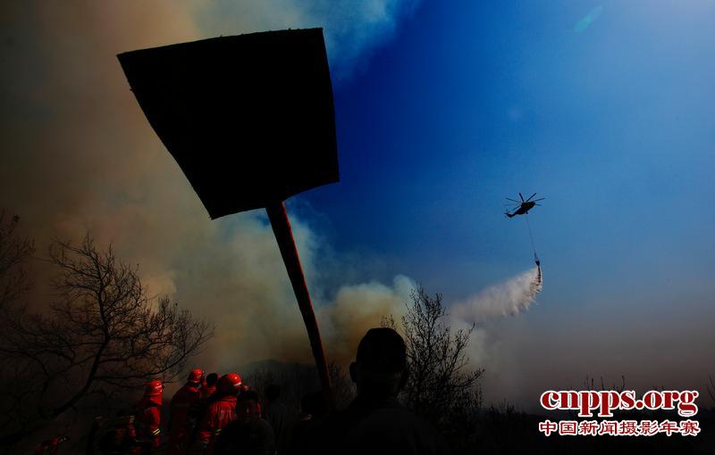 4月19日,济南长清万德镇店台村卧龙峪,一名村民肩扛自制扑火工具等待火势减弱后进入火场扑火。(第二届中国新闻摄影年赛战争、灾难类新闻组照铜奖)