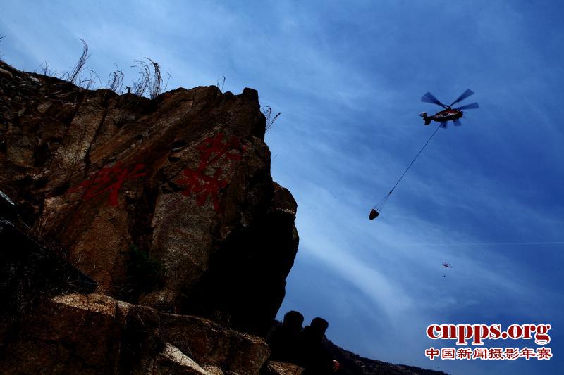 4月20日下午,济南市长清区邵庄水库,一架参与灭火的K-32直升机下降高度准备取水。(第二届中国新闻摄影年赛战争、灾难类新闻组照铜奖)