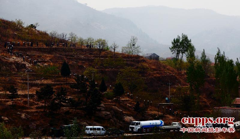 4月20日下午,济南市长清区邵庄水库,一队解放军官兵身背水桶行走在通往火场的山路上。(第二届中国新闻摄影年赛战争、灾难类新闻组照铜奖)