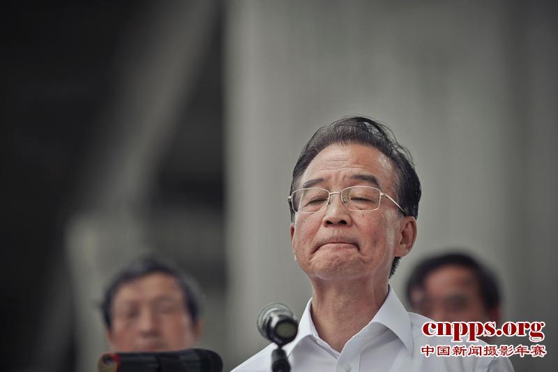 2011年7月28日,国务院总理温家宝在温州动车事故现场神情凝重。当日温总理视察时表示,铁道部门和有关方面是否把救人放到了首位,要给群众一个实事求是的回答。(第二届中国新闻摄影年赛战争、灾难类新闻组照银奖)