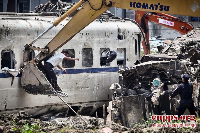 2011年7月24日,温州动车事故现场,救援人员从跌在地面的车厢中抛出一个乘客的书包。