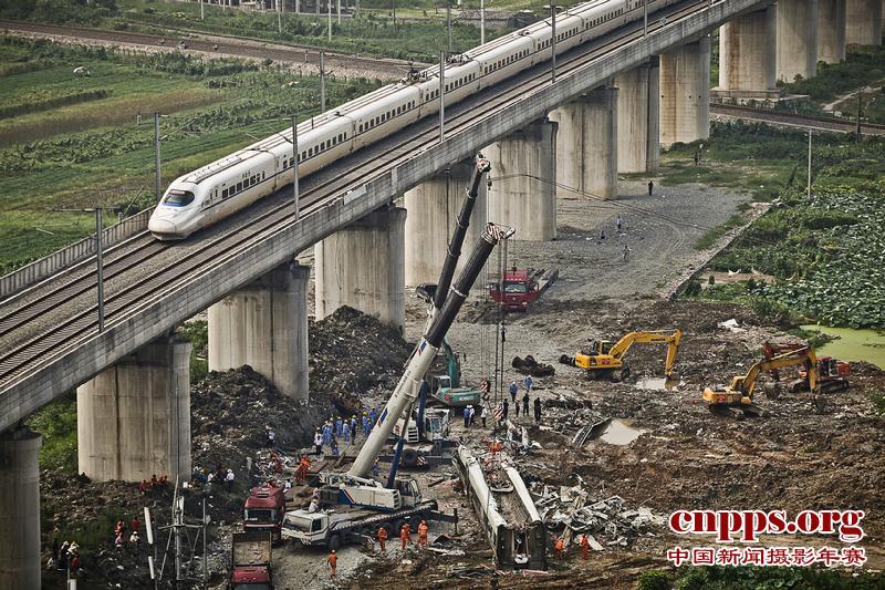 2011年7月26日,温州动车事故现场,最后一节较完整车厢准备装至平板车运离,此时出事的高架路段已经恢复通车。
