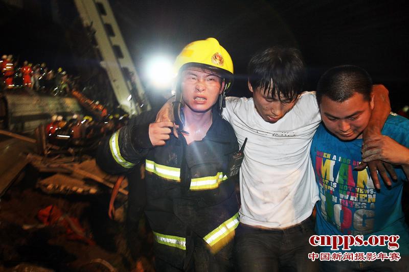 7月23日21时49分,陆续赶来的救援人员在温州动车追尾事故现场全力抢救伤员。