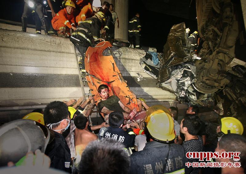 23日12时54分,军民接力将一名受伤乘客从坠落的车厢里抬出。