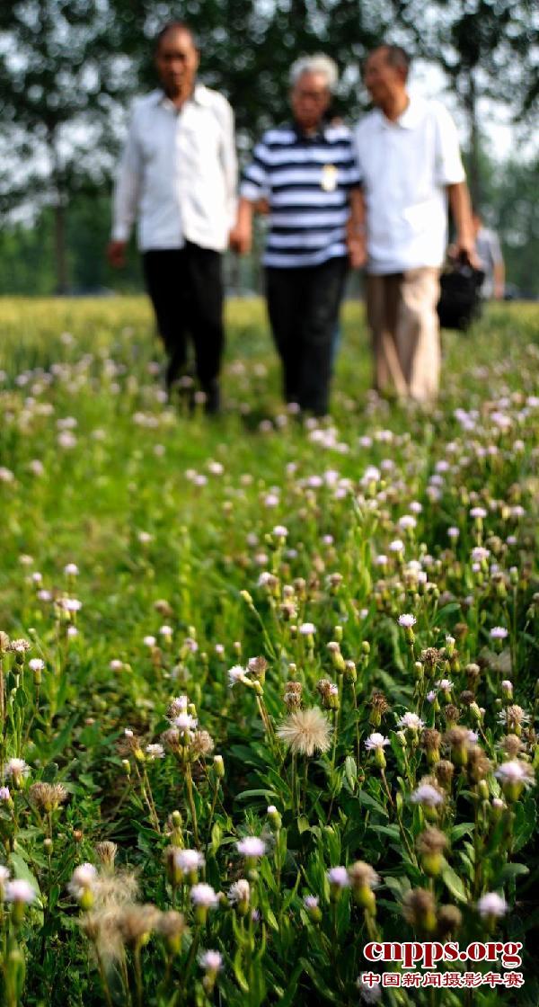 2011年5月17日,回到家乡的刘大江在亲人搀扶下漫步在儿时的乡间小道上