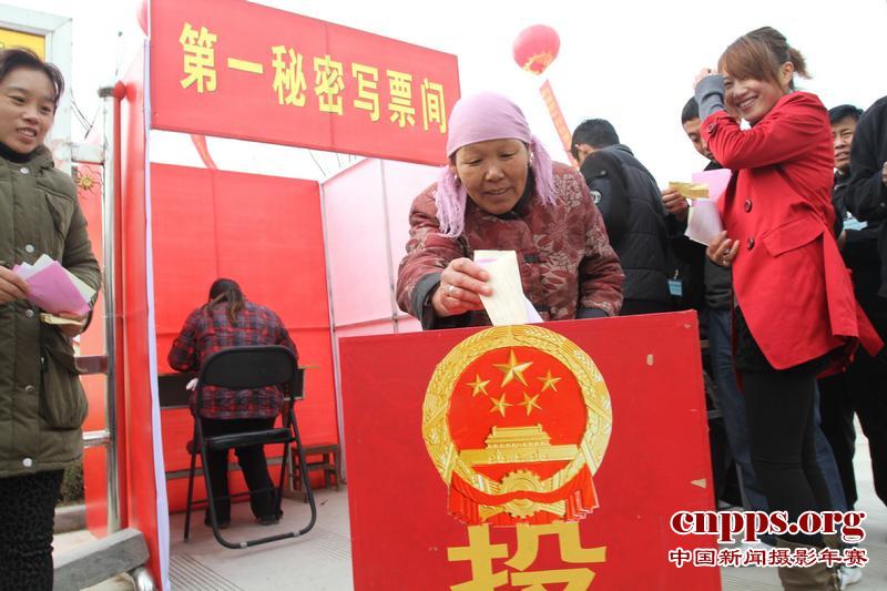 2011年11月19日上午,在商丘市睢阳区宋城办事处曹吴庄村第七届村民委员会选举大会上,村民祝秀芝在第一秘密写票间写好选票后,将选票投入了投票箱。