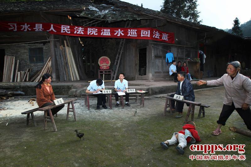 2011年5月23日下午,贵州省习水县人民法院温水巡回法庭的法官吴相波和冯光建,经过20多公里崎岖的山路、近两小时的舟车颠簸到达此次执法的目的地白沙埂,审理群英村中心组村民罗天福、穆文怀夫妇的离婚纠纷案,当天的庭审在原、被告家院落前的空地上开庭了。(第二届中国新闻摄影年赛军事法制类单幅银奖)