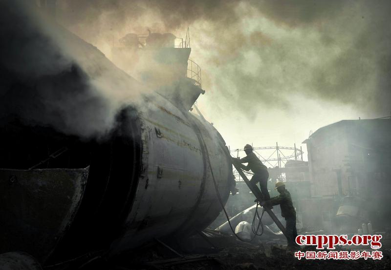 2011年11月14日,福州市区一家化工厂,两名工人们用焊枪在切割铁罐。