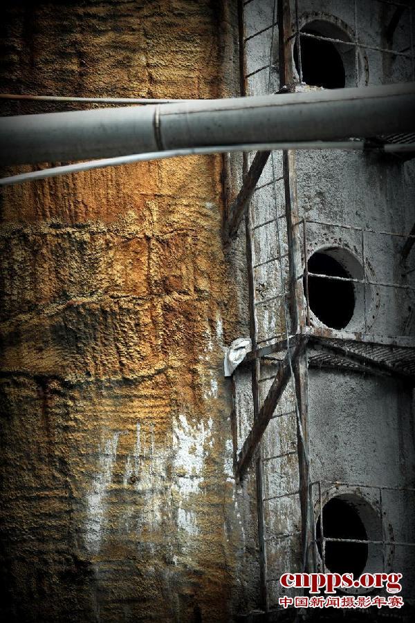 2011年11月14日,福州市区一家正在拆迁的化工厂,腐蚀生锈的罐体。