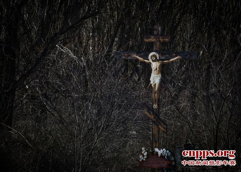 距离切尔诺贝利核电站三公里处的死城普利皮亚季,入口,一座十字架。