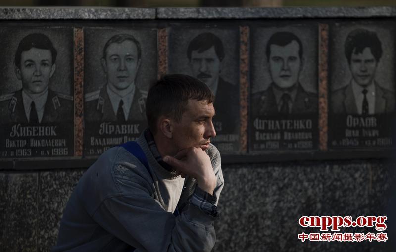 2011年4月16日,乌克兰斯拉夫蒂奇,这是一座新城,住户大多是25年前,从切尔诺贝利地区撤离的人员。一名住户在切尔诺贝利牺牲人员的墓碑前思考。