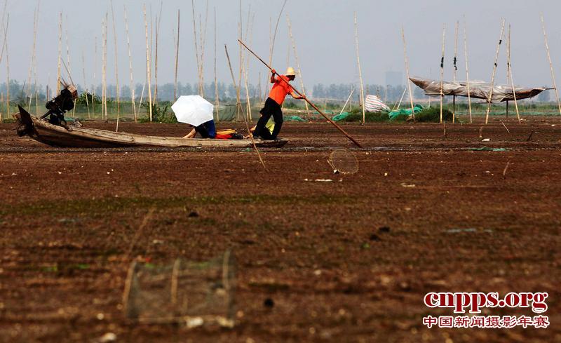 2011年5月29日,一名渔民在河沟内用力撑船,远远看去,船如同在陆地上行驶。而几个月前,这里却是烟波浩渺的洪湖湖底,渔民们在干涸的湖底挖出一条小水沟,用沟内仅存的积水来行船。(第二届中国新闻摄影年赛自然及环境类组照铜奖)