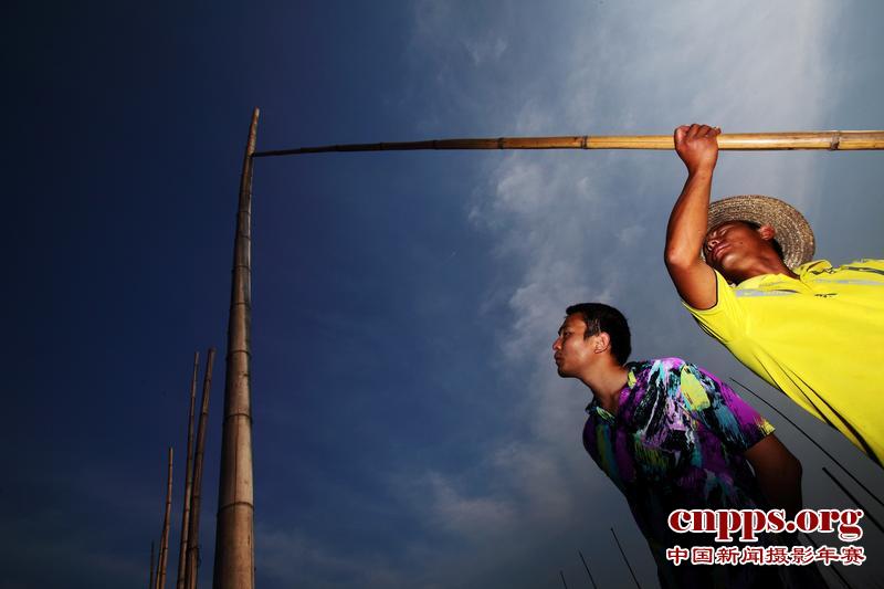2011年5月29日,渔民陈传发竹篙所指之处,是去年这个时候的洪湖水位,如今这里已经完全干涸。