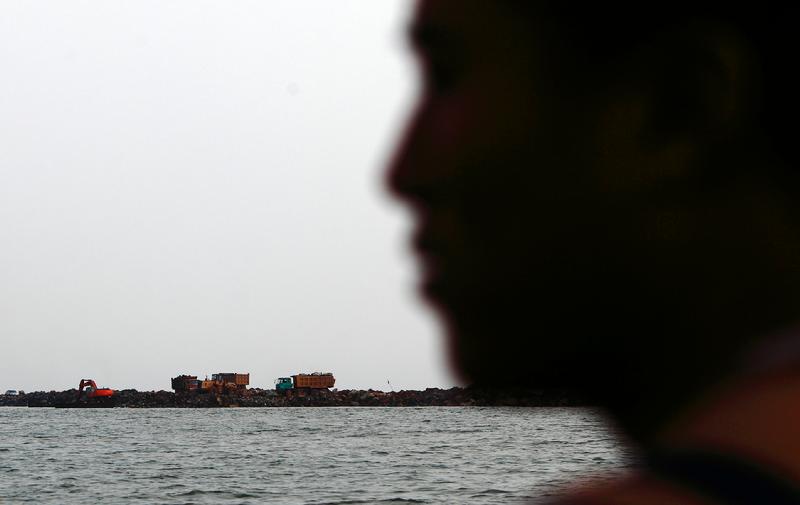 2011年10月14日,辽宁省大连市金州区七顶山,出海打鱼的渔船行驶中,沿岸可见许多施工的车辆,渔民李颜龙说那是在围海建造海参养殖场。