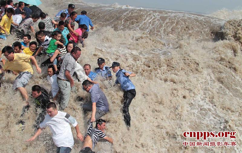 2011年8月31日,浙江海宁,钱江潮涌上大堤将观潮者冲下堤坝。当日是农历八月初三,正值天文大潮,同时受“南玛都”台风影响,钱塘江出现近9年来最大潮。据悉,这次大潮造成20余位观潮游客受伤,被送往长安镇海宁市第三人民医院救治,伤势较重人员均系被潮水冲倒后撞在石头上或因人员挤压所造成骨折。(第二届中国新闻摄影年赛自然及环境类单幅银奖)