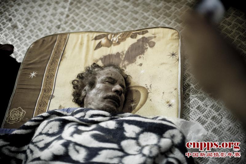 这是2011年10月22日在利比亚米苏拉塔一间冷库内拍摄的利比亚前领导人卡扎菲的尸体。利比亚“全国过渡委员会”执行委员会主席贾布里勒10月20日在新闻发布会上证实,卡扎菲当天在苏尔特身亡。(第二届中国新闻摄影年赛新闻人物与肖像类单幅金奖)
