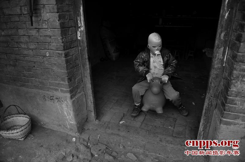 上学前,杨伟豪还不忘骑上橡皮马玩一会。