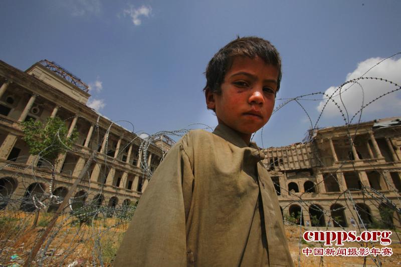 2011年8月13日,喀布尔,孩子在被铁丝网及干枯罂粟包围的老王宫外伸手乞讨