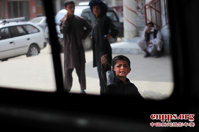 2011年8月13日,喀布尔街头兜售小商品的男孩。