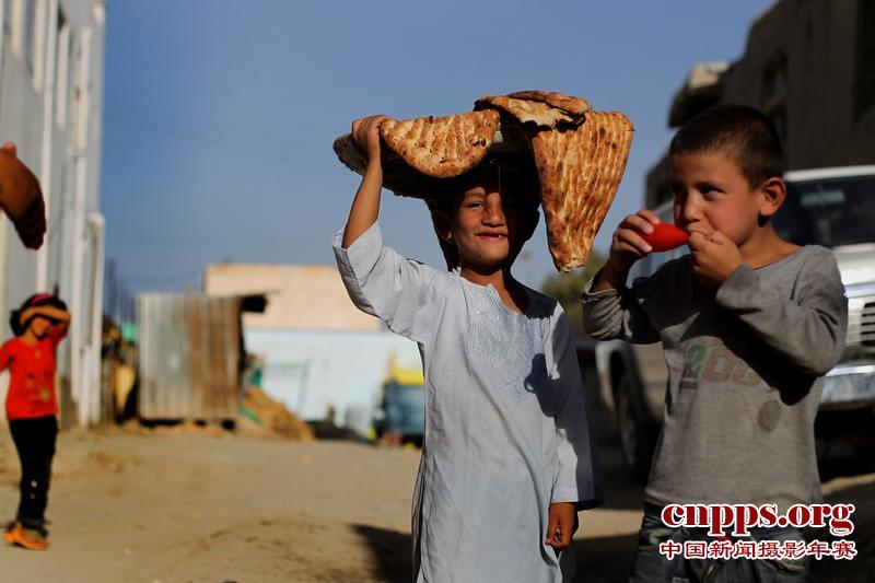 2011年8月13日,喀布尔街头,一位来自富裕家庭的男孩子炫耀新买到的馕。