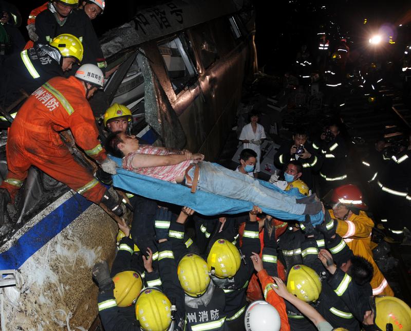 2011年7月23日晚上20点30分左右,甬温线永嘉站至温州南站间,北京南至福州D301次列车与杭州至福州南D3115次列车发生追尾事故,导致4节车厢脱轨并甩出高架掉落地面,多节车厢受损严重,众多群众伤亡。浙江公安消防总队紧急出动600多名官兵赶赴现场救援,经过近10个小时的紧张救援,成功营救出200多名被困群众,疏散1000多名群众。(第二届中国新闻摄影年赛非战争灾难类重大新闻单幅铜奖)