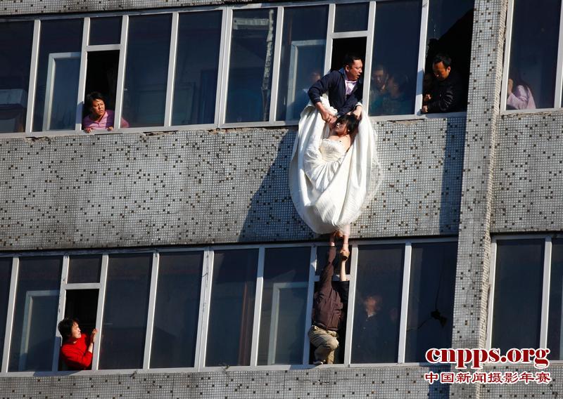 2011年5月17日15时,一名身穿婚纱的22岁女子,坐在了长春市贵阳街与吴淞路交会处一栋居民楼7楼的窗台上,情绪异常激动。16时21分许,女子突然纵身跳下。危急关头,长春市宽城区新发街道办事处主任郭中凡当空搂住了她的脖子,经过54秒的时间将她救起。(第二届中国新闻摄影年赛非战争灾难类重大新闻单幅银奖)