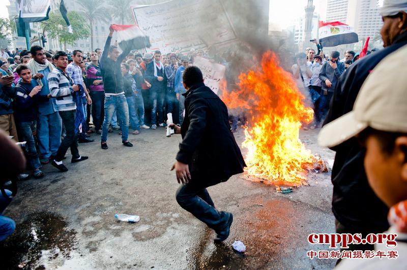 2011年11月24日,埃及开罗解放广场,示威者点燃火堆表达政治诉求。当天距埃及大选仅剩一天。