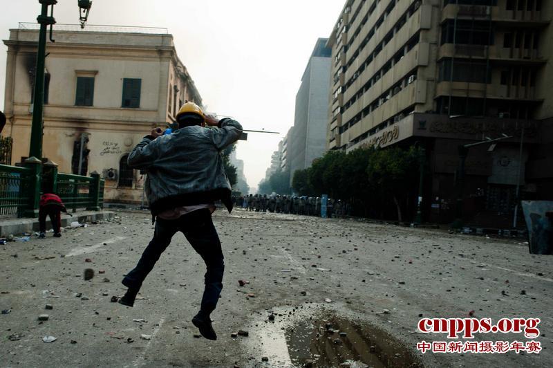 2011年12月17日,埃及开罗解放广场,示威者躲避军警投掷的石块。当天,埃及开罗等地的骚乱仍在继续,数百人死伤。