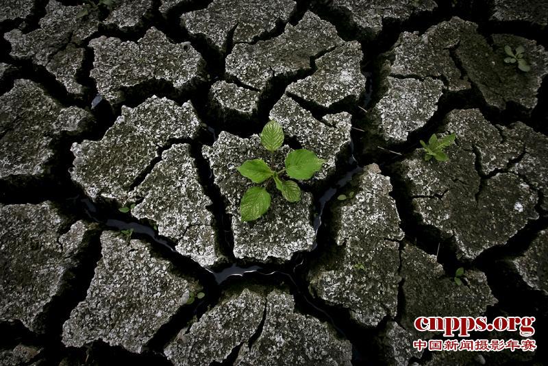 2011年5月25日,在中国湖北省武汉市汉江支流府河,一株植物的幼苗在干涸的河床上生长。