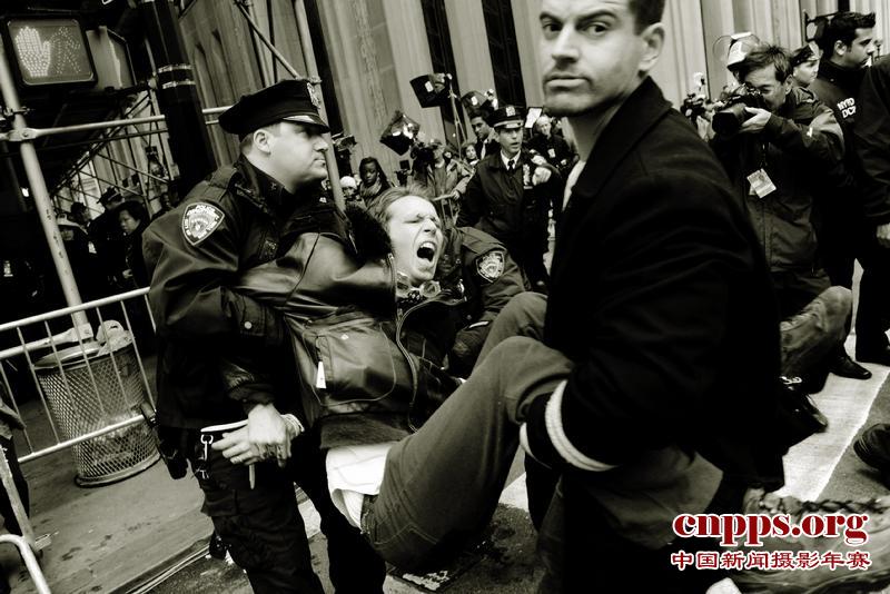 这是2011年11月17日,在纽约华尔街入口处,纽约警察逮捕一名示威者。当日,示威者在纽约华尔街附近集会游行,并一度封堵通往纽约证券交易所的街道。纽约警方先后拘捕数十名示威者。(第二届中国新闻摄影年赛非战争灾难类重大新闻组图金奖)