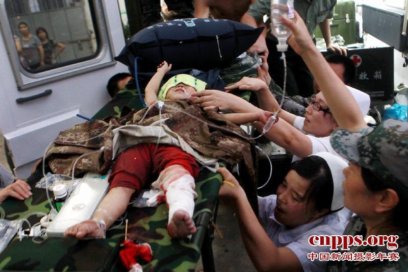 7月24日,“7·23”甬温线特别重大铁路交通事故救援现场,2周岁半的小伊伊,在几乎被铲平的车厢中被困20多个小时后获救,被紧急送往温州市解放军118医院。(第二届中国新闻摄影年赛非战争灾难类重大新闻单幅金奖)