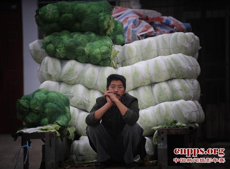 2011年11月4日,安徽蚌埠怀远县沙沟村,大片成熟的大白菜,却少见菜农收割。近日,全国普遍出现大白菜滞销现象,安徽也能幸免。怀远县的菜农们算了一笔账,大白菜一斤只能卖1毛钱,甚至更低,这样的价格让他们很“受伤”。(第二届中国新闻摄影年赛经济及科技类新闻单幅优秀奖)