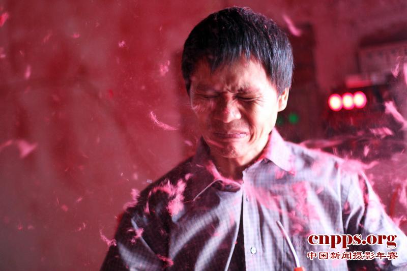 加工车间内,飞舞的棉絮让人睁不开都眼睛,对身体伤害很大。