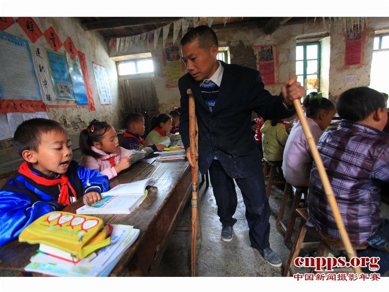 10月21日,恩施土家族苗族自治州巴东县一位双腿瘫痪的代课老师谭定才,拄着双拐在海拔1400米的深山代课25载。在病魔危及生命时,他为自己准备了一口棺材与时间赛跑,“只要有一口气在,就要多带一天学生,绝不让一个娃失学”。(第二届中国新闻摄影年赛文化与教育类新闻单幅铜奖)