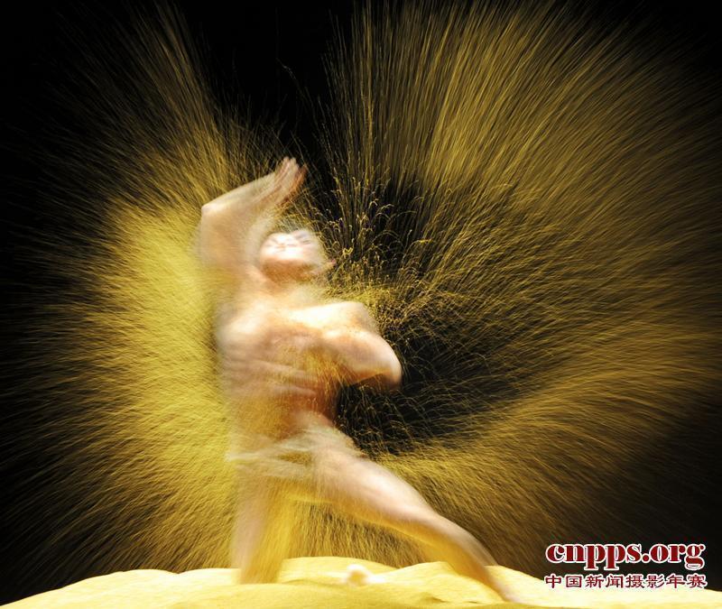 2011年5月6日,在湖北省武汉市,“云门舞集”的舞者在彩排《流浪者之歌》。舞蹈的特点是用了3500公斤稻谷作道具。《流浪者之歌》的创作者为林怀民,首演至今已有17年,走遍18个国家52个城市,演出超过160场。(第二届中国新闻摄影年赛文化与教育类新闻单幅银奖)
