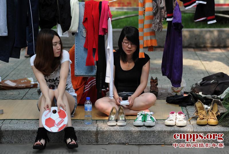 6月22日,安徽合肥一所大学校园里,两名女孩在变卖自己的生活用品。大学生离校变卖生活用品已经成为一种潮流。