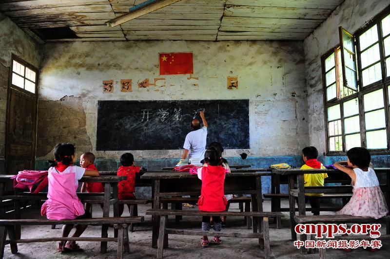 孩子们在破旧的教室内上课。
