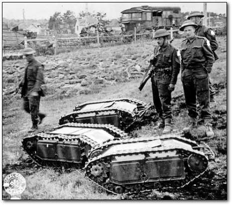 上面这张照片摄于诺曼底登陆后不久,照片里是4名英国士兵和缴获的3架德国“巨人”微型遥控爆破车。但它们不是自动的,而需由几个纳粹分子在附近拿着操纵杆远程遥控。这就没那么可怕啦!