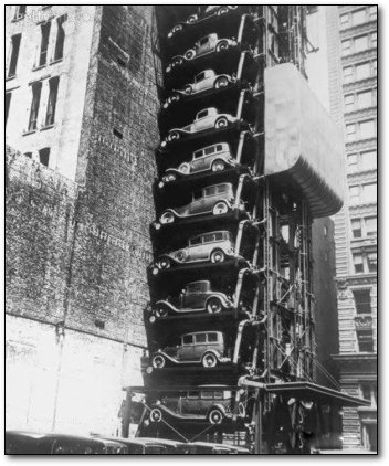 这并不是什么可笑的“未来之城”概念艺术作品。1936年,摄影师约翰·加德曼于芝加哥拍下了这个“升降车库”,这张照片展现了另一个角度。我们所能想象的画面就是我们扔下一枚硬币取回汽车,然后看见它就像贩卖机里的袋装薯条一样卡在了机器里。