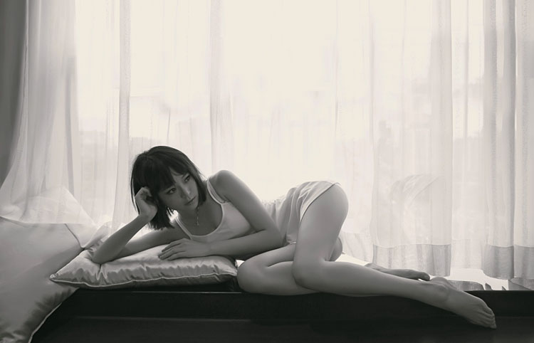 如果让女孩侧身在窗边撑起身体,女孩很自然地会蜷缩自己的身体。保持这个身姿不动可以进行伸展身体的调整,在此基础上向后伸出一条腿向前伸出手,将头部重心后放。