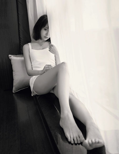 如果让女孩在窗户边坐起来,首先需要做的就是改变拍摄机位,一味地在正面拍摄侧面照会让坐姿的画面变得平庸,因为无法近距离捕捉到女孩的面部表情与眼神,最佳的拍摄位置在窗户的一边,可以把窗户前的区域看做是一个完整的空间,这样竖构图拍摄就可以让女孩的双腿变得修长,也可以让整个身体在竖幅构图中成为画面中的对角线。让女孩站起来又会有全新的创作风格,让女孩从室内走向外,进到帘子里去隔着一层薄薄的窗帘拍摄。一层窗帘可以很好地实现朦胧效果。当然站起为了在纱帘之后展现出女孩最好的身姿,一定不要让女孩的身体与窗帘有过多的接触,如果造成局部“死黑”就很难看出哪些是阴影哪些是身体曲线了,千万注意。