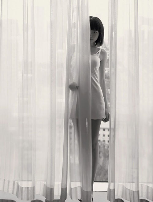 正面站立会让女孩多少不自然,这样只会让女孩的身体线条显得更加的“生硬”。与其这样,不如选择一些更加夸张的动作,让这个帘后空间变得“躁动”起来,拍摄出女孩身体上想从帘后进入房间内的“动势”。