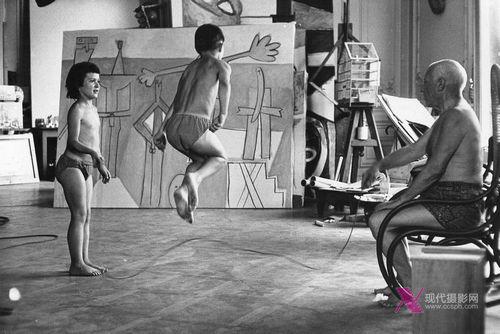 毕加索和孩子帕洛玛,克劳德一起在家中玩耍,1957年
