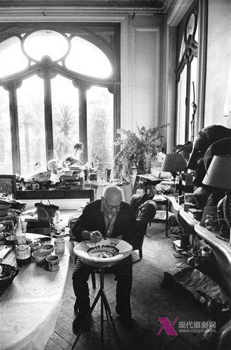 毕加索在戛纳家中餐厅进行创作,在陶器上作画,1957年