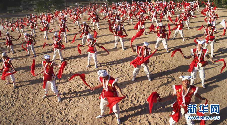 5月30日,村民在延安市安塞区冯家营村文化大舞台为游客表演安塞腰鼓(无人机拍摄)新华社记者 陶明 摄