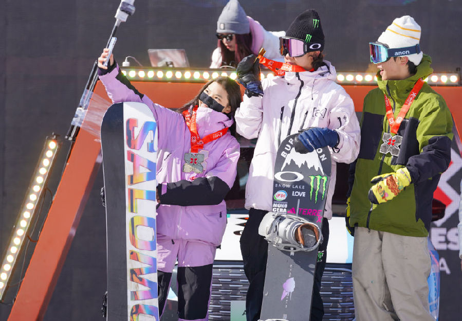 2月25日,苏翊鸣(中)、荣格(左)和姜鑫杰在颁奖仪式上合影。新华社记者颜麟蕴摄