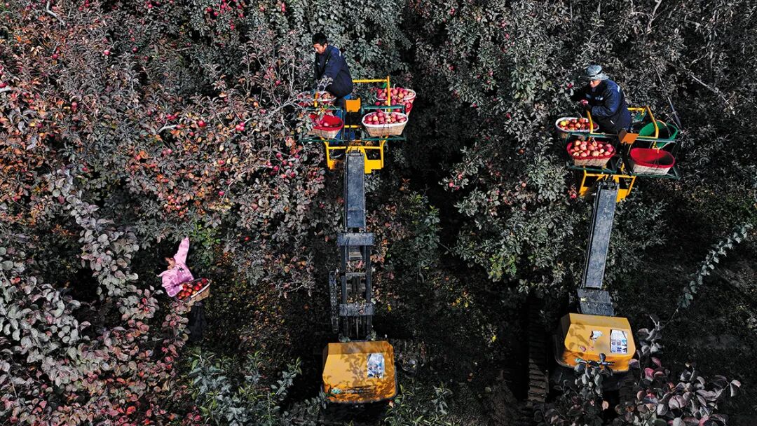 10月23日,在新疆生产建设兵团第一师阿拉尔市六团双城镇三连职工利用采摘机在采摘苹果。人民政协报记者 齐波摄